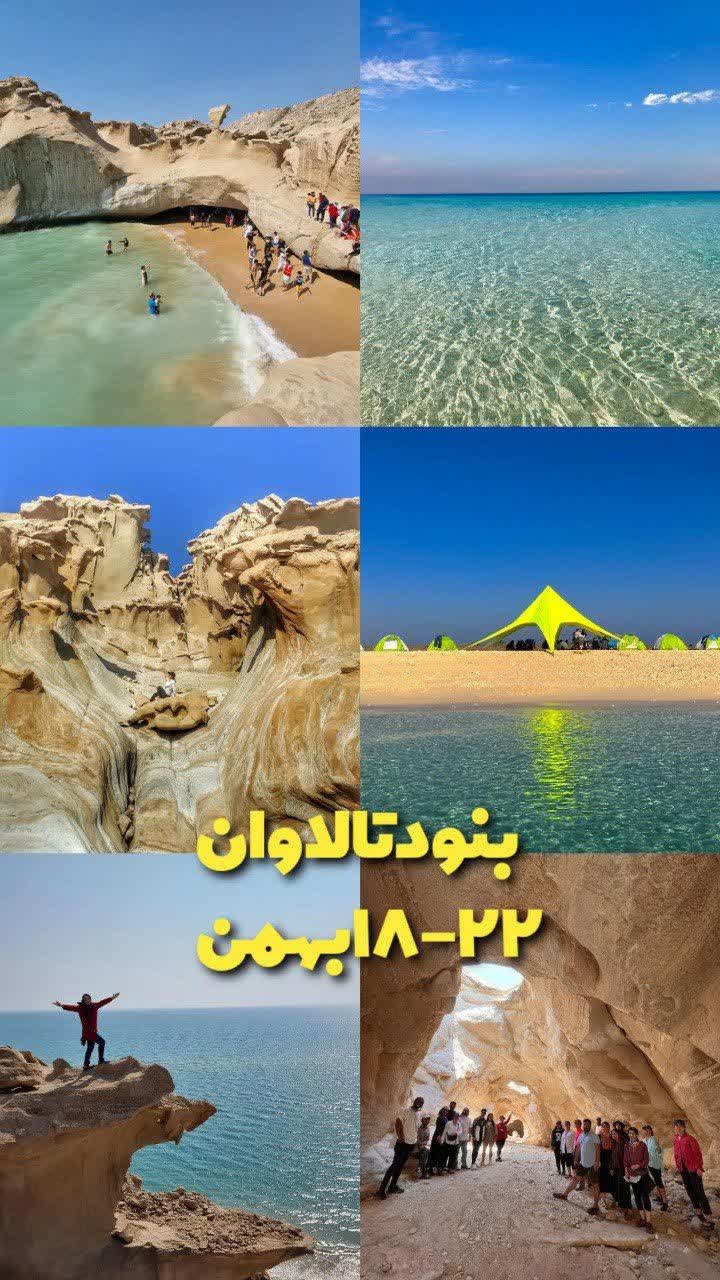 سفر گروهی با اتوبوس و قایق آب تنی در خلیج فارس مجموعه زیباییهای سواحل خاص جنوب غار ساحلی بنود ساحل شنی بنود لوکیشن فیلم محمد رسول الله ساحل زیبای جزیره مارو یا لاوان ساحل مکسر گردنه عشاق ساحل هاله و خلیج نایبند غار گیری کنار جنگل حرای نایبند دورنمای فلر های عسلویه بازارهای منطقه آزاد عسلویه کمپینگ و شب نشینی دور آتش