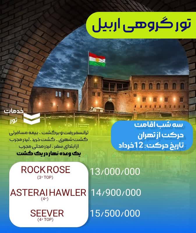 روز اول ورود به هتل و تحویل اتاق برنامه گشت خرید از ساعت 5 الی 6 حرکت از هتل به مرکز خرید گرند مجیدی مال و اوتلت های همیشه در تخفیف روز دوم گشت شهری ساعت ۱۰ الی ۱۱ حرکت از هتل به سمت سایت های : مسجد جلیل خیاط ارگ کهن اربیل بازار قیصریه پارک و ساعت شهر بازار لنگه پارک شانه در و تله کابین بین پارک شانه در تا پارک مناره(هزینه تله کابین به عهده مسافرمیباشد.) بازدید از منطقه لاکچری امپایر و دریم سیتی *وکلی گشت های آپشنال*